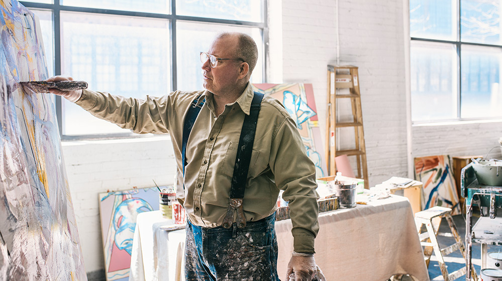 He found connections to his passion everywhere. Even spreading hot tar became just another medium for creative inspiration: “I’d watch the designs,” he says of his long days up on a roof. His background still comes in handy when he’s building his own canvas stretchers or crates to ship pieces to galleries and customers around the world. That disciplined attention to detail is all part of his creative process. “It helps me to be more in the moment. To be more alive, more there.”